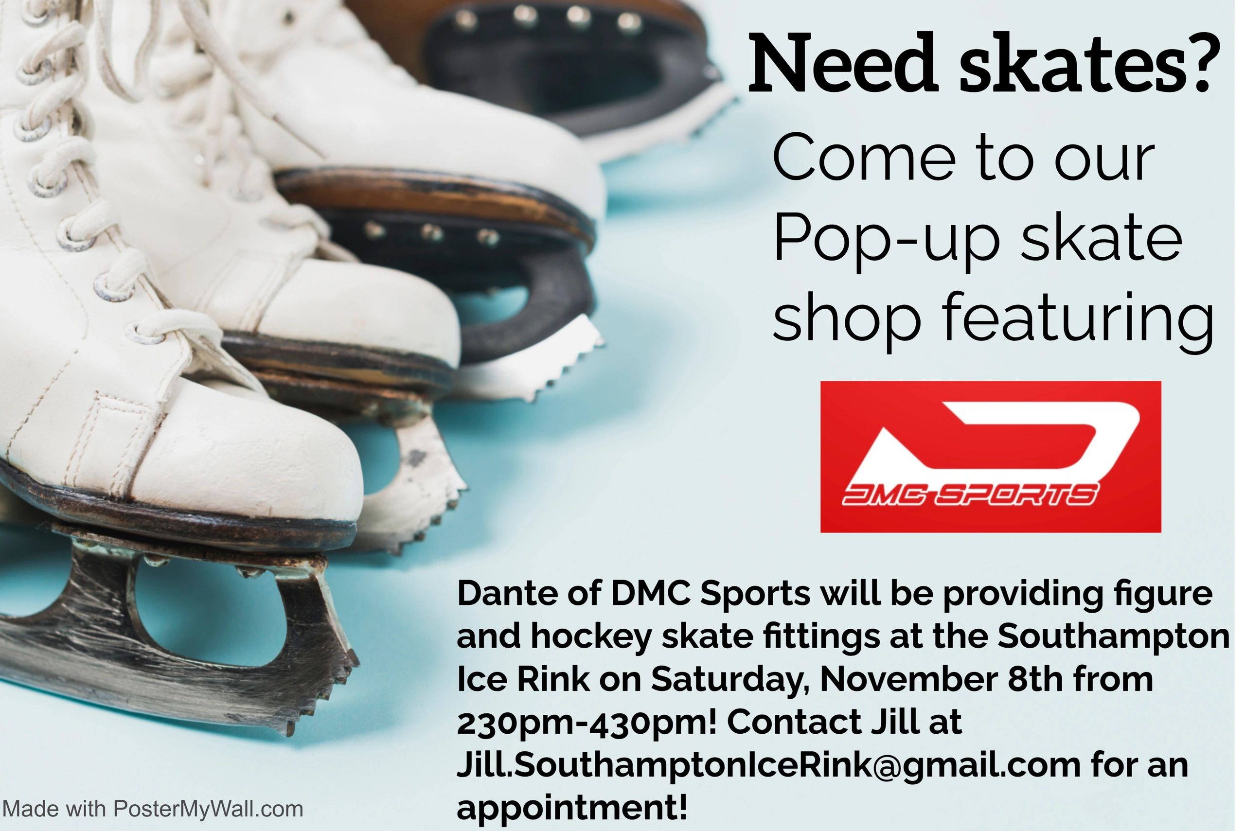 Are your old skates worn out or too small? Are you new to the sport and want to get your own skates instead of using rentals? Come to our pop-up skate shop this Saturday! Dante, from DMC Sports will be visiting the Southampton Ice Rink for skate fittings for both hockey and figure skates!